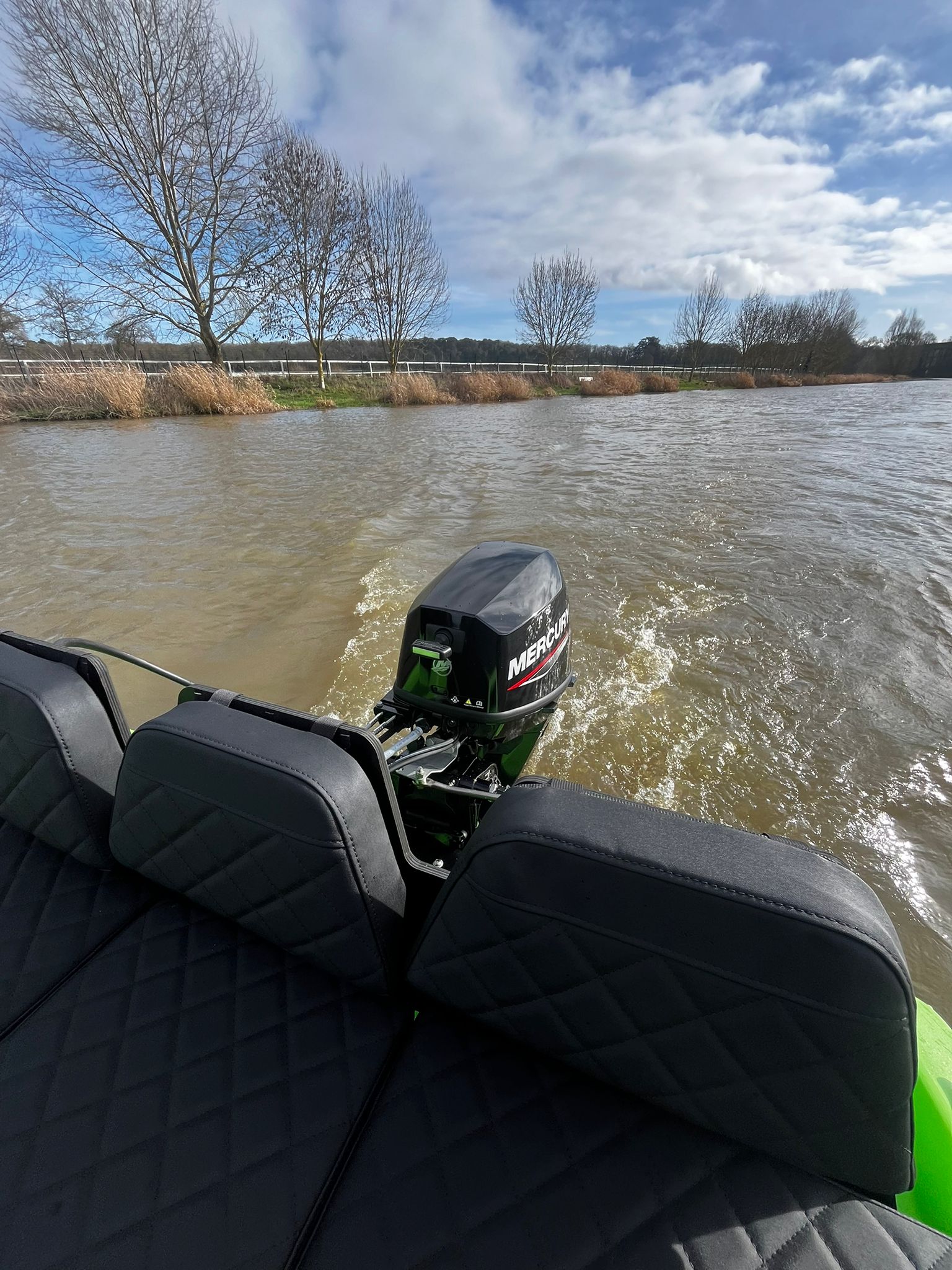 Petite embarcation sans permis motorisée d’un moteur Mercury 6 CV bicylindre, et équipé d’un bimini avec coussins à bord.